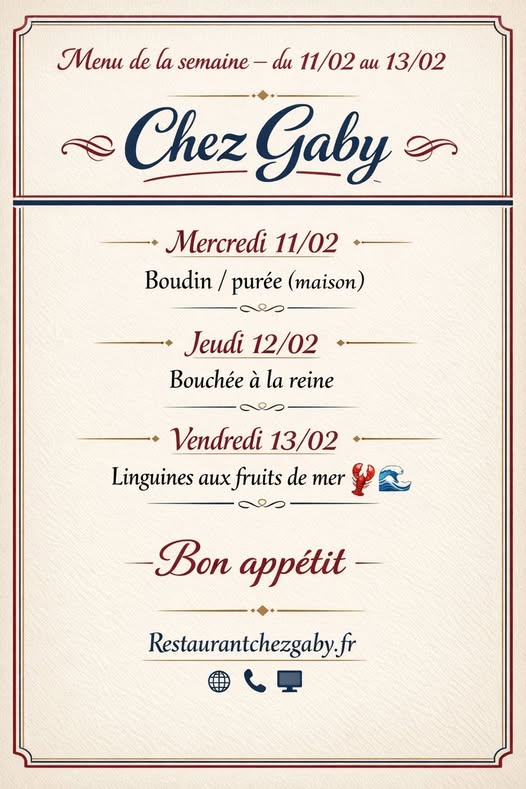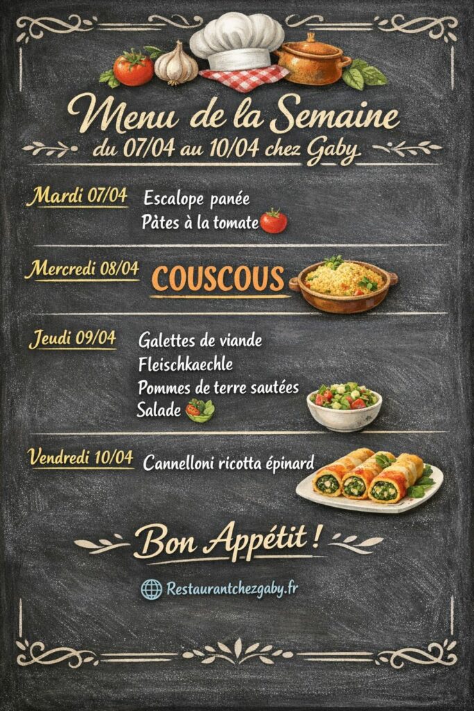 Chez GABY, tous les premiers Mercredi du Mois à midi Couscous (agneau, poulet, boulette de viande, mergez, légumes (sur réservation)